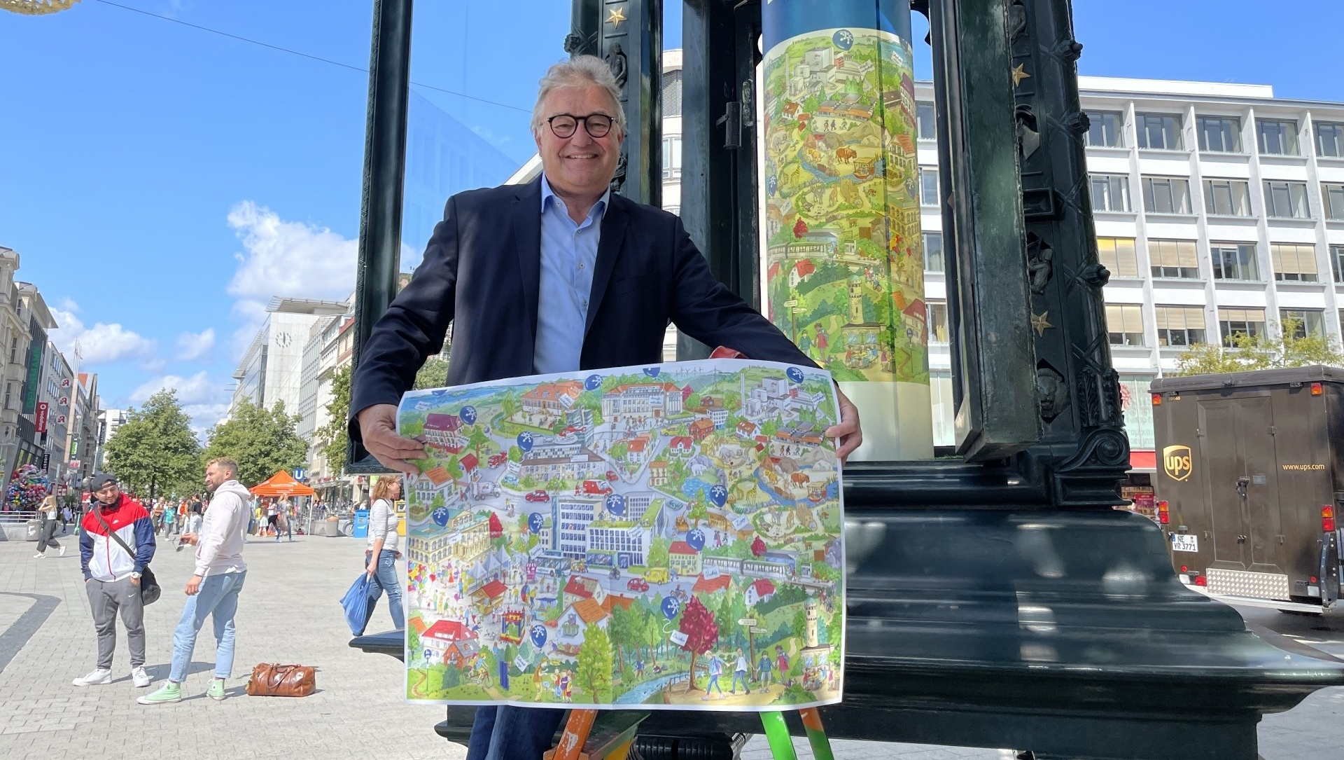 Bildunterschrift: Regionspräsident Hauke Jagau präsentiert das „Wimmelposter“ an der Kröpcke-Uhr.
