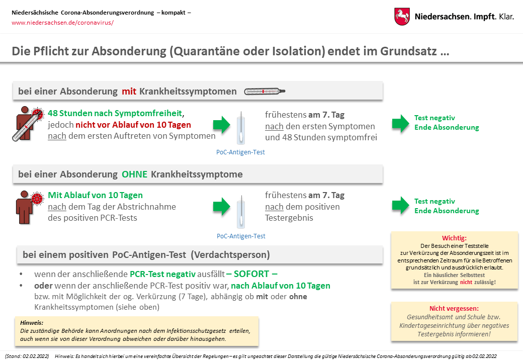 - Der bisherige § 5 Abs. 1 S. 4 AbsV wurde gestrichen - Die Beendigung der Pflicht zur Isolierung bei Beschäftigen in Krankenhäusern, Pflegeeinrichtungen und Einrichtungen der Eingliederungshilfe , die mindestens 48 Stunden symptomfrei sind, kann nun nicht mehr ausschließlich durch eine PCR-Testung erfolgen, sondern ist nun grundsätzlich auch mit einem anerkannten PoC-Antigen-Test zur patientennahen Durchführung durch Dritte möglich. Damit setzt Niedersachsen Punkt 6 des Beschlusses der Konferenz der Ministerpräsidentinnen und Ministerpräsidenten der Länder mit der Bundesregierung (MPK) vom 24. Januar 2022 in der Absonderungsverordnung um.