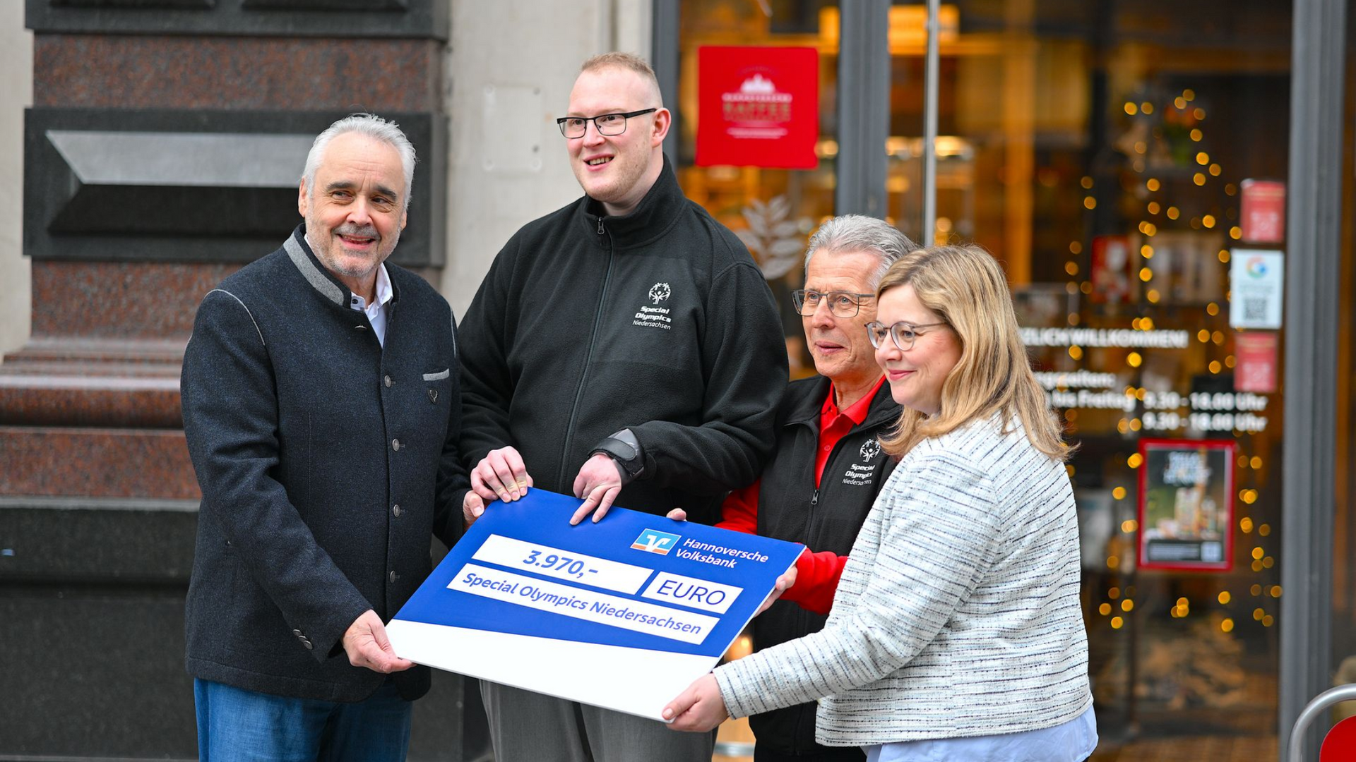 Hannoversche Kaffeemanufaktur und Hannoversche Volksbank unterstützen Special Olympics Niedersachsen Die Hannoversche Volksbank setzt bei der Bewirtung ihrer Kundschaft sowie der Versorgung ihrer Mitarbeiterinnen und Mitarbeiter auf den Kaffee der Hannoverschen Kaffeemanufaktur. Über den Kaffeegenuss hinaus wollen beide Unternehmen Gutes tun und haben vereinbart, je verbrauchtes Kilo Kaffee einen Euro an Special Olympics Niedersachsen, der Sportorganisation für Menschen mit geistiger oder mehrfacher Behinderung, zu spenden. Für die Jahre 2024 und 2025 konnten Andreas Berndt, Geschäftsführer der Hannoverschen Kaffeemanufaktur und Anne Mahler, stellv. Vorstandsmitglied der Hannoverschen Volksbank jetzt genau 3.970 Euro übergeben. Uwe Lübking, Vize-Präsident von Special Olympics Niedersachsen und Athletensprecher Kevin Struß zeigten sich begeistert. Dazu Uwe Lübking: „Der sogenannte Kaffee-Euro ist ein tolles Beispiel dafür, wie aus einer alltäglichen Entscheidung echte Unterstützung entsteht. Jeder getrunkene Kaffee hilft dabei, mehr Sport, mehr Teilhabe und mehr Begegnung möglich zu machen.“ Die Special Olympics Niedersachsen wurden 2006 gegründet und sind einer von 16 Special Olympics Deutschland-Landesverbänden. Die Kernaufgabe von Special Olympics ist es, ganzjährige und regelmäßige Trainingsprogramme und Sportwettbewerbe für Menschen mit kognitiver Beeinträchtigung zu organisieren und durchzuführen. Das Ziel soll sein, Kindern und Erwachsenen mit geistiger und mehrfacher Behinderung durch eine Vielzahl von Sportarten Zugangs- und Wahlmöglichkeiten zur Teilhabe am gesellschaftlichen Leben zu verschaffen. Hannoversche Volksbank Fotos/Video: © 11.03.2026 Matthias Falk - hannover_fotografie