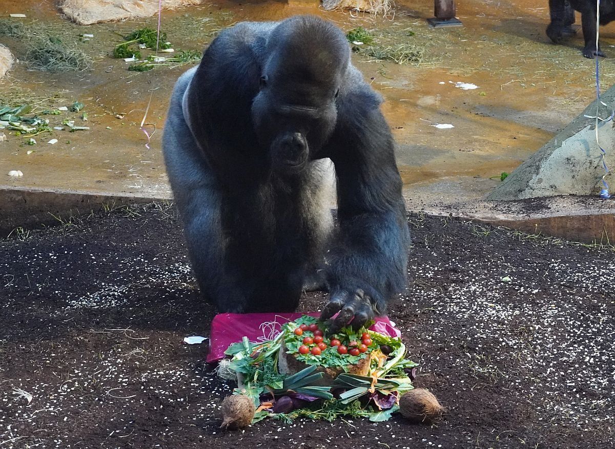 Die Tierpflegerinnen und Tierpfleger hatten die Gorillaanlage für den runden Geburtstag leckere Quarkkleckse und Körner verteilt, damit alle sechs Gorillas am Geburtstagsbüffet teilhaben konnten. Buzandi ging zunächst zielstrebig auf die Reistorte zu, pickte sich eine einzelne Tomate aus der 30 heraus und drehte den großen Kucken dann einfach um, auf der Suche nach weiteren versteckten Köstlichkeiten. Die liebevoll arrangierte Dekoration aus Roter Beete, Petersilie, Karottenstreifen, Radicchio und Löwenzahn überließ er seinem Clan.