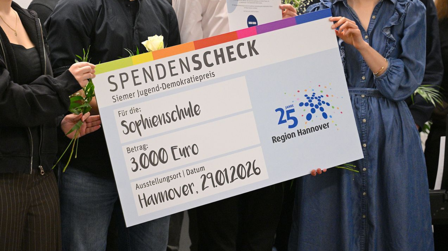 Sophienschule erhält Karl-Heinz Siemer Jugend-Demokratiepreis Geschichte erleben, Erinnerungen wachhalten, Demokratie stärken: Der Karl-Heinz Siemer Jugend-Demokratiepreis geht in diesem Jahr an die Schüler*innen der Sophienschule Hannover. Verliehen wird der mit 3.000 Euro dotierte Preis in der Gedenkstätte Ahlem der Region Hannover, mit der die Schüler*innen der Sophienschule seit mehr als zehn Jahren eine vielfältige Kooperation leben. „Der Jugend-Demokratiepreis, der Karl-Heinz-Siemer-Preis, ist Erinnerungskultur, die lebt. Die sich einmischt. Die Haltung zeigt. Liebe Sophienschule, dieser Preis passt zu Euch. Und Ihr passt zu diesem Preis. Seit mehr als zehn Jahren arbeitet ihr nun mit der Gedenkstätte Ahlem zusammen. Und ihr zeigt: Erinnerung kann immer neue Wege gehen, ohne ihren Kern zu verlieren“, sagt Regionspräsident Steffen Krach bei der Verleihung des Preises in der Gedenkstätte. Ministerpräsident Olaf Lies richtete sich mit einem Grußwort, das verlesen wurde, an die Schüler*innen der Sophienschule: „Euer und Ihr Engagement für eine zeitgemäße, lebendige Erinnerungskultur ist zutiefst beeindruckend. Dass ihr heute den Siemer Jugend-Demokratiepreis als zweite Schule überhaupt verliehen bekommt, zeigt, wie wichtig euer Einsatz für Erinnerung und Demokratie ist – und dass ihr bereit seid, Verantwortung in unserer Gesellschaft zu übernehmen.“ Auch Hannovers Oberbürgermeister Belit Onay richtete sich mit einem verlesenen Grußwort an die Anwesenden: „Die heutige Preisverleihung steht in einem gesellschaftlichen Kontext, der aktueller kaum sein könnte. Demokratie ist keine Selbstverständlichkeit. Sie braucht Menschen, die sich einmischen, Verantwortung übernehmen und bereit sind, sich mit Geschichte und Gegenwart kritisch auseinanderzusetzen.“ Raphael Heinrich ist Lehrer für Geschichte an der Sophienschule. Er erinnert sich an die Anfänge der Kooperation mit der Gedenkstätte Ahlem von vor mehr als zehn Jahren: „Seitdem ich Lehrer bin, quält mich vor jeder Unterrichtsstunde zum Nationalsozialismus die Frage: Mache ich das so, dass meine Schülerinnen und Schüler es nicht nur verstehen können, sondern auch das eigentlich unfassbare menschliche Leid fassen, das aus dem Scheitern der ersten deutschen Demokratie folgte? Dass sie daraus ihre ganz eigenen, authentischen, persönlichen Konsequenzen für ihre Zukunft ziehen?“ Durch die Zusammenarbeit mit der Gedenkstätte sei es gelungen, Erinnerungskultur tatsächlich lebendig zu gestalten, so Heinrich. Seine Kollegin Anne Katrin Möller begleitet seit vielen Jahren Schüler*innen des 12. Jahrgangs der Sophienschule bei der Gestaltung des Holocaust-Gedenktages: „Anders als im Geschichtsunterricht, wo es um objektive und distanzierte Betrachtung geht, ist die Vorbereitung auf den Gedenktag am 27. Januar ein Blick in das eigene Innere und ein echter Balanceakt für die 16- und 17-Jährigen. Denn es geht um die Themen Gewalt, Unterdrückung, Folter, Hinrichtung, Massenmord, Elend, Leid und Qual, Trauer und Trauma der Überlebenden und deren Nachkommen.“ Damit verbunden sie ihr Dank in Richtung der Gedenkstätte Ahlem: „Danke, dass ich meine Schülerinnen und Schüler auf ihrem mutigen Weg nicht allein begleiten muss.“ Eine dieser Schülerinnen ist Paula Castaneda-Busche. Sie hat den Holocaust-Gedenktag vor zwei Tagen, am 27. Januar, gemeinsam mit ihren Mitschüler*innen gestaltet. „Immer wieder begegne ich in meinem Alltag Hass und Diskriminierung gegenüber Minderheiten. Mir liegt es am Herzen, dass ich mich für Gerechtigkeit, Sicherheit und Freiheit einsetze und meine Werte auch an die nächsten Generationen weitergebe“, sagt die Jugendliche. 2023 hat Karl-Heinz Siemer den Jugend-Demokratiepreis das erste Mal verliehen, damals an die Heisterbergschule. „Wir müssen unsere Demokratie beschützen und bewahren – in der heutigen Zeit jeden Tag ein Stückchen mehr“, sagt der Preisstifter. Kinder und Jugendliche sind ihm ein besonderes Anliegen. „Junge Menschen gehen immer wieder neu mit dem Thema Erinnerungskultur um. Das macht Gedenken nicht nur lebendig, sondern auch greifbar für ihre Altergenossinnen und -genossen“, so Siemer weiter. Zur Zusammenarbeit der Gedenkstätte Ahlem und der Sophienschule Die Kooperation zwischen der Gedenkstätte und der Sophienschule ist die am längsten bestehende Zusammenarbeit der Gedenkstätte und hat sich seit ihrer offiziellen Begründung im Jahr 2015 kontinuierlich und erfolgreich entwickelt. Von Beginn an wurden der regelmäßige Austausch und die enge Kommunikation zwischen den Lehrkräften der Sophienschule und der Pädagogik der Gedenkstätte gepflegt. Inzwischen ist das Wissen über die Gedenkstätte und ihre Themen an der Schule breit verankert: Zahlreiche Lehrkräfte sowie viele Schüler* haben die Gedenkstätte besucht und sich intensiv mit der Geschichte der nationalsozialistischen Verbrechen auseinandergesetzt. Ein zentraler Bestandteil der Kooperation sind die jährlich stattfindenden Projekte zum Holocaust-Gedenktag am 27. Januar. Seit 2016 gestalten Schüler*innen – insbesondere der Oberstufe – die Gedenkfeiern mit vielfältigen Beiträgen. Die Kooperation wurde über die Jahre stetig ausgebaut: Jährliche Besuche aller 10. Klassen in der Gedenkstätte, Fortbildungen für Lehrkräfte sowie neue Projektformate wie Film- und Theaterproduktionen erweiterten die Zusammenarbeit. Mit der Ausbildung von sogenannten „Sophienscouts“ ab 2022 erhielt die Kooperation eine weitere nachhaltige Dimension. Schüler*innen übernehmen dabei Verantwortung sowohl im schulischen Alltag als auch in der pädagogischen Arbeit der Gedenkstätte. Die Zusammenarbeit zeigt modellhaft, wie lebendiges Gedenken gelingen kann und den Blick in die Zukunft richtet – ganz im Sinne des Mottos: „Befreiung endet niemals“. Region Hannover Fotos: © 29.01.2026 Matthias Falk - hannover_fotografie
