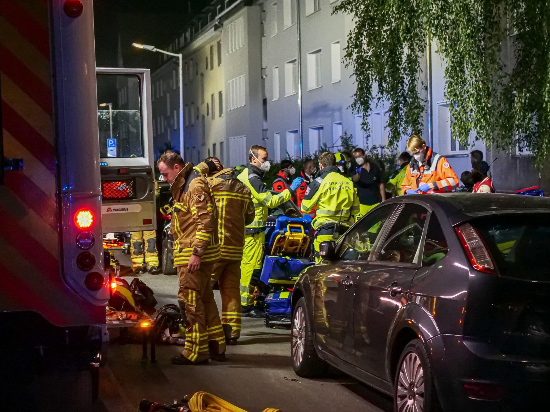 Hannover (ots) - In der vergangenen Freitagnacht, 17.06.2022, haben 16 Bewohnende eines Mietshauses in der Pelikanstraße Verletzungen durch einen Brand im Keller erlitten. Zwölf Mietparteien flüchteten auf das Dach und wurden durch die Feuerwehr gerettet. Glücklicherweise bemerkten aufmerksame Bewohnende den Brand rechtzeitig und warnten die Nachbarn.