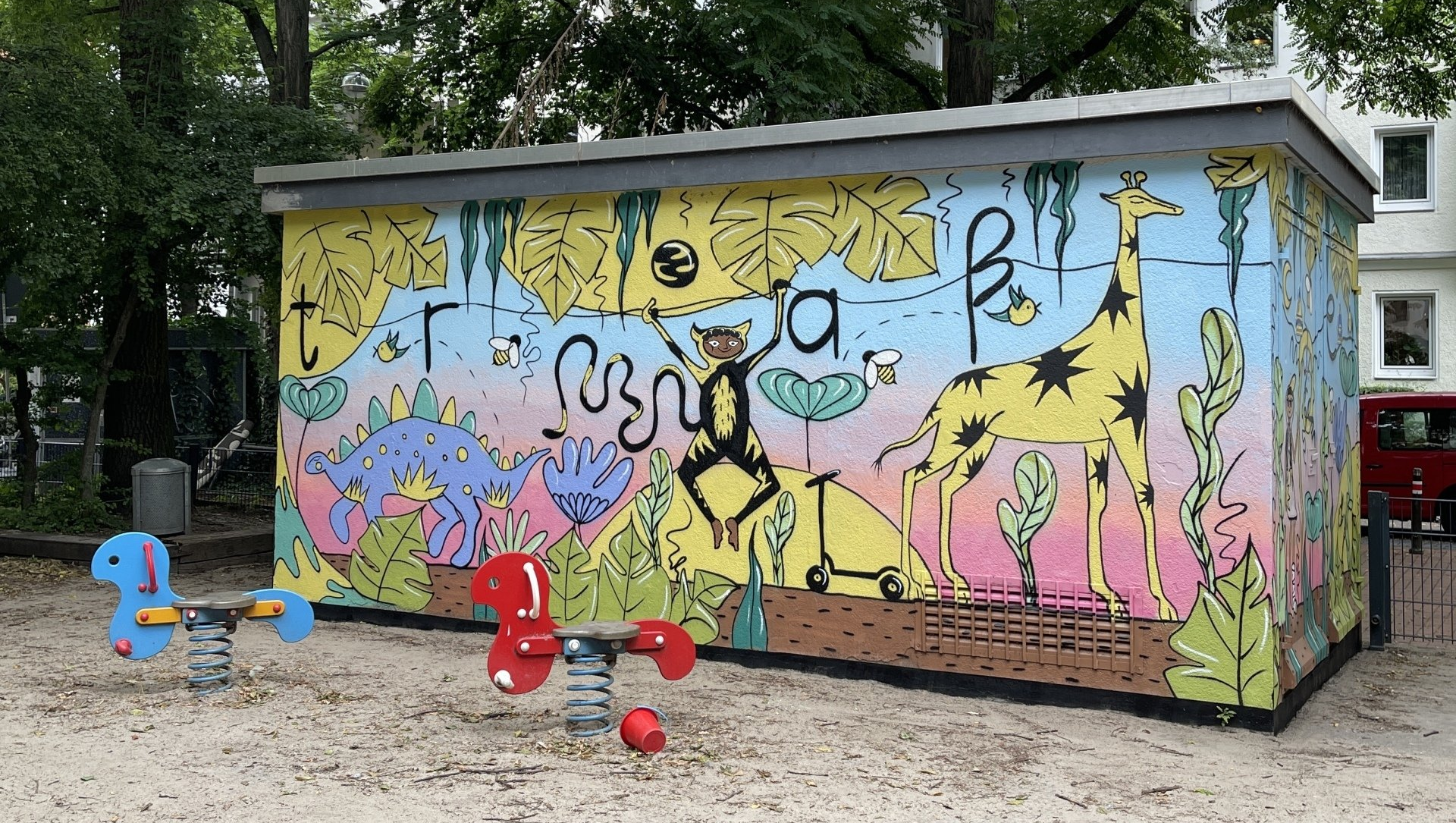 Trafohäuschen auf Spielplatz Fundstraße wurde von der Künstlerin „Etaja“ fantasievoll besprüht